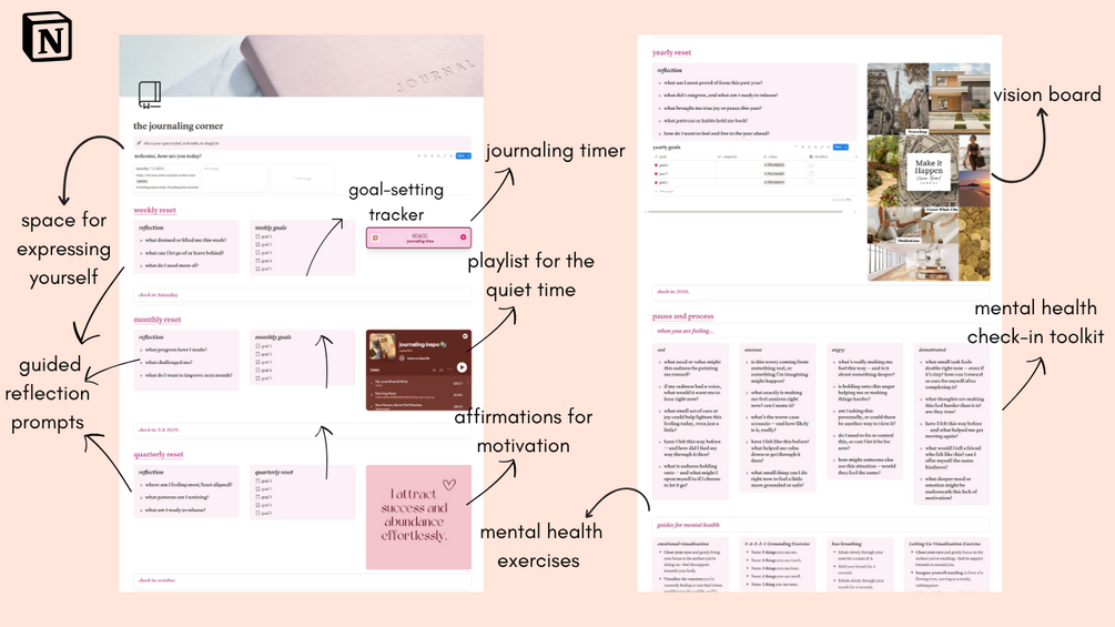 The Journaling Corner is an all-in-one journaling space designed to help you check in with yourself weekly, monthly, quarterly, and yearly. With guided prompts, goal-setting tools, and mental health resources, it’s the perfect balance between structure and softness.