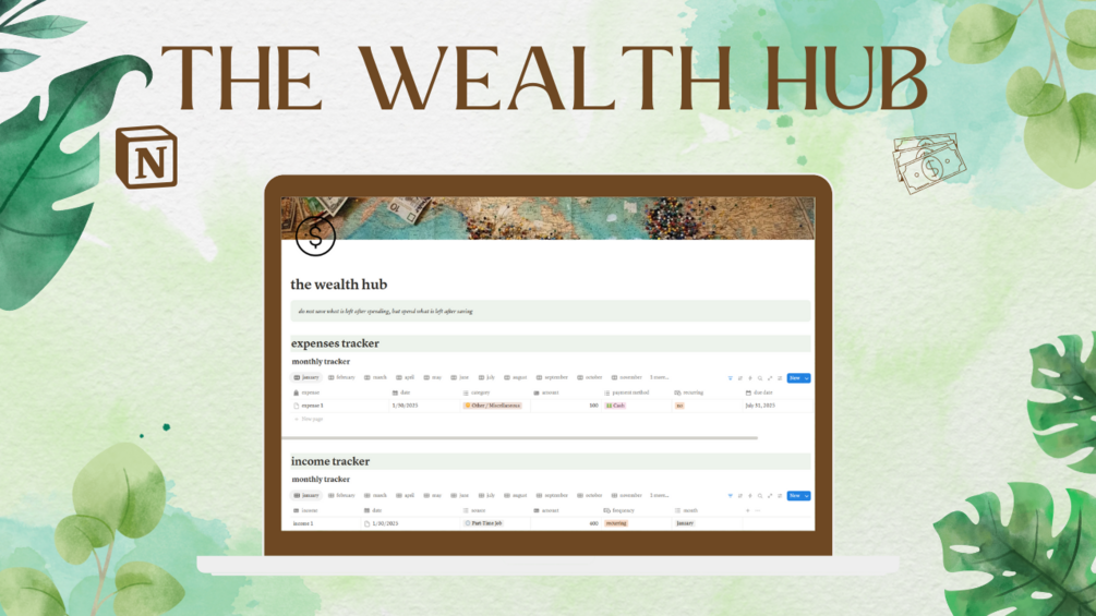 The Wealth Hub is a thoughtfully designed Notion template to help you track your income, expenses, savings, and financial goals β all in one easy-to-use dashboard.